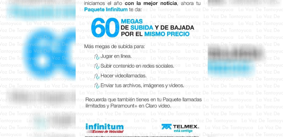Los usuarios residenciales que tienen el paquete $389, disponen ya de 60 Megas de subida y de bajada de acceso a Internet, además de su línea TELMEX con llamada ilimitadas, almacenamiento de 100 GB en Claro Drive, Antivirus y acceso a Claro video con Paramount+ e Infinitum mail.