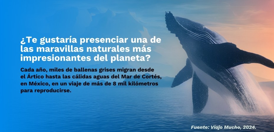 Cada año, entre los meses de diciembre y abril, miles de ballenas grises migran desde el Ártico hasta las cálidas aguas de la Península de Baja California, en México, en un viaje de más de ocho mil kilómetros para aparearse, dar a luz y amamantar a sus crías. Este avistamiento de ballenas, en el Mar de Cortés, es una de las maravillas naturales más impresionantes del planeta, y una gran oportunidad para los turistas que buscan una experiencia de vida inolvidable.