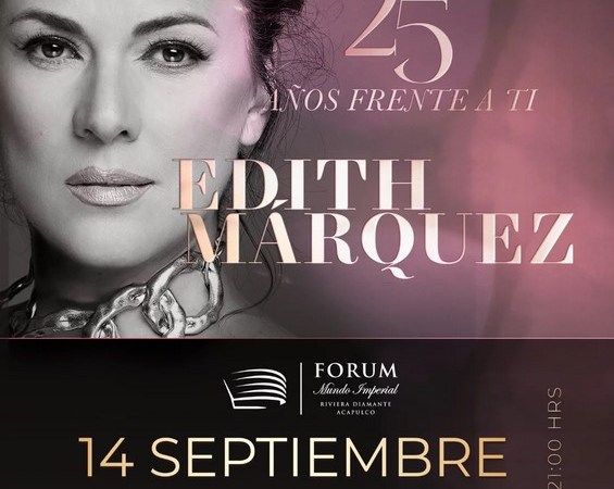 La noche del 14 de septiembre en punto de las 21:00 hrs. Forum Mundo Imperial se llenará de gala con el concierto de Edith Márquez, una de las cantantes mexicanas más reconocidas por sus interpretaciones y talento que presenta su gira “25 Años frente a ti”.