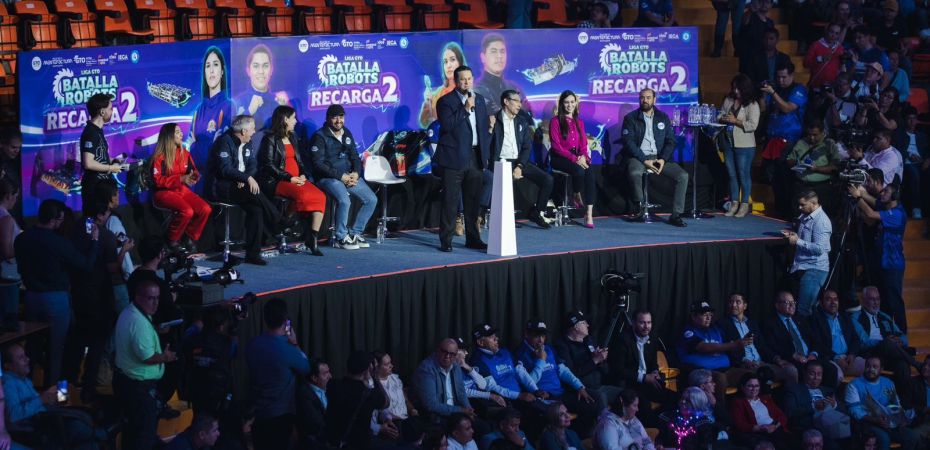 León, Gto.- El Gobernador del Estado, Diego Sinhue Rodríguez Vallejo, inauguró el torneo Batalla de Robots Recarga2, evento en el que se exhiben las habilidades de las y los jóvenes guanajuatenses, a fin de que puedan experimentar una evolución de la aplicación de los conocimientos en robótica, adquiridos durante su formación.