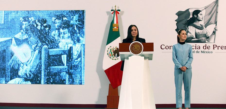 *La subsecretaria de Educación Básica, Noemí Juárez Pérez, presenta una semblanza sobre Rita Cetina Gutiérrez como parte de la sección “Mujeres en la historia” en la Mañanera del Pueblo