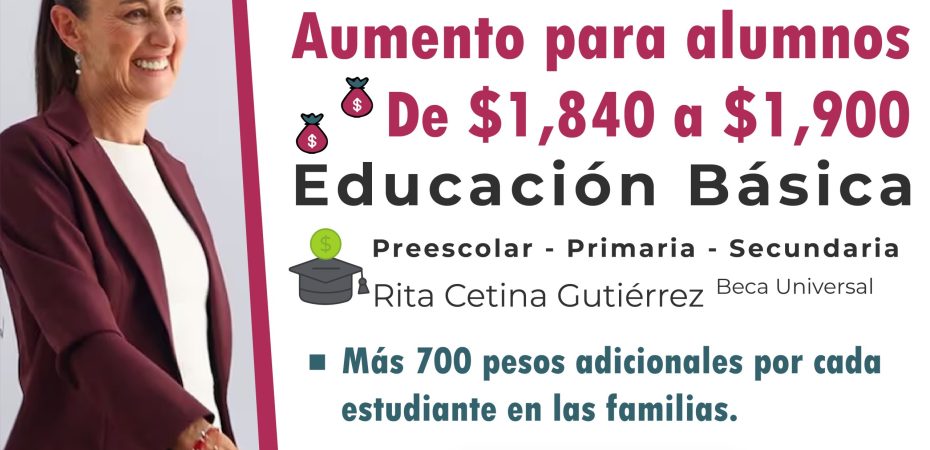 Recordó que, con la nueva Beca Universal “Rita Cetina Gutiérrez”, las y los alumnos de nivel secundaria recibirán, a partir de 2025, mil 900 pesos bimestrales, a los que se suman 700 pesos por cada estudiante adicional de la familia beneficiaria.