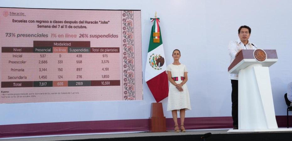 Informó que luego del paso del huracán “John”, el 97 por ciento de las escuelas en el estado ya están en clases presenciales, el 2 por ciento lo hacen en línea y en 16 planteles se sigue trabajando para retomar las actividades escolares.