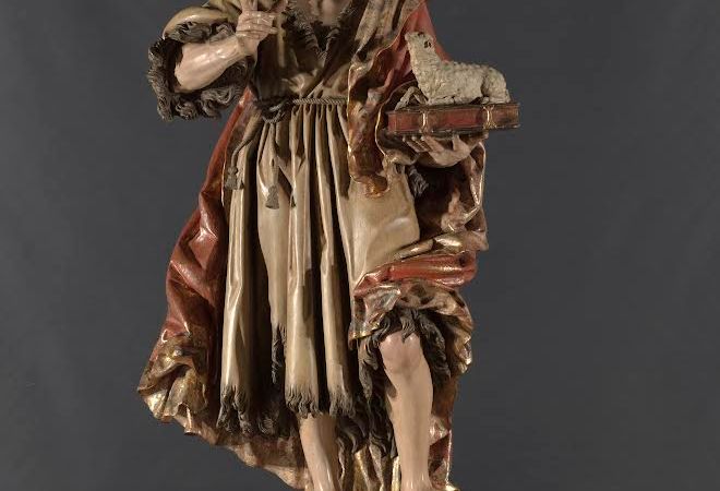 Sobre las esculturas señala que San Juan Bautista de Juan de Mesa representa a San Juan Bautista en pie, sosteniendo el libro sagrado sobre el que se dispone el cordero, en su mano izquierda, mientras que el brazo derecho se alza hacia el espectador en actitud declamatoria.