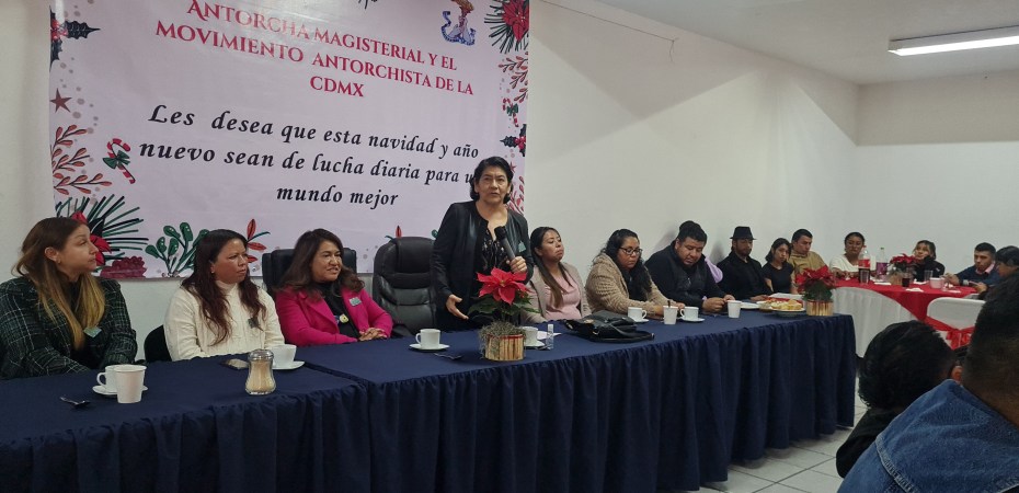 Ante un nutrido grupo de docentes de las escuelas fundadas por el Movimiento Antorchista en la capital del país, la dirigente del antorchismo capitalino, Gloria Brito Nájera, en un evento navideño felicitó a los maestros por la noble labor que desempeñan, la de educar a niños y jóvenes, para convertirlos en individuos nuevos, más inteligentes y más preparados para afrontar la situación tan difícil que ocurre en nuestro país y que cada día se vuelve más complicada en todos los aspectos.