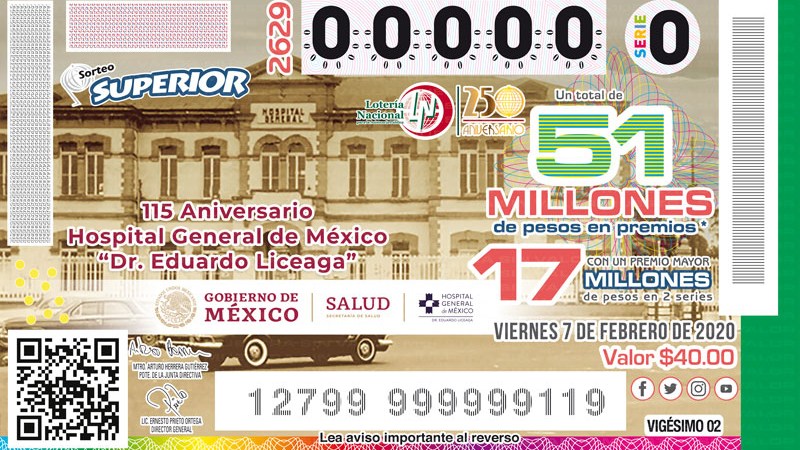 Forma parte de las celebraciones del 120 aniversario del Hospital General de México “Dr. Eduardo Liceaga” adquiriendo tu billete individual del sorteo No. 3960 de la Lotería Nacional por $30 pesos y $600 pesos por serie completa.