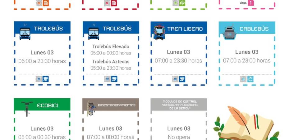 Con fundamento en el artículo 74, fracción II de la Ley Federal del Trabajo, y con motivo de la conmemoración del 108 Aniversario de la Constitución Política de los Estados Unidos Mexicanos, la Secretaría de Movilidad (SEMOVI) informa el ajuste de horarios de operación de la Red de Movilidad Integrada (MI) para el próximo lunes 3 de febrero: