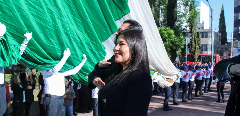 Ciudad de México.-La alcaldesa de Iztacalco, Lourdes Paz Reyes, encabezó ayer lunes la ceremonia del «Día de la Bandera».