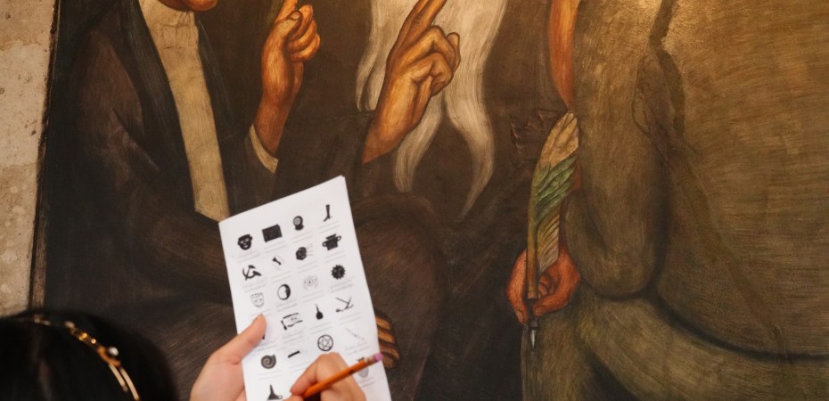 Las actividades de la segunda Noche de Museos del Museo Vivo del Muralismo (MVM), en el marco del Día Internacional de la Lengua Materna, comenzaron con la Búsqueda del tesoro mural. En esta dinámica, los visitantes, organizados en equipos de cinco personas, exploraron los murales del Patio del Trabajo y el Patio de las Fiestas para descubrir símbolos, siluetas, objetos e imágenes. Estas imágenes fueron recuperadas de la crónica Monjas, perfumes y mensajes secretos del muralismo mexicano, del escritor y documentalista Federico Mastrogiovanni.