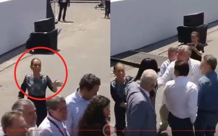 En un video que se hizo viral, se capta este enigmático momento en que la presidenta Claudia Sheinbaum Pardo arriba al área del templete preparado para la ocasión. En su recorrido, la presidenta va saludando de mano a los asistentes y le da un beso a su esposo, antes de llegar a la primera fila en donde se encontraban de espaldas al templete, el hijo de Andrés Manuel López Obrador, Andy López Beltrán; la presidenta nacional de Morena, María Luisa Alcalde, el senador Adán Augusto López, el diputado Ricardo Monreal; el senador del Verde Ecologista Manuel Velasco.