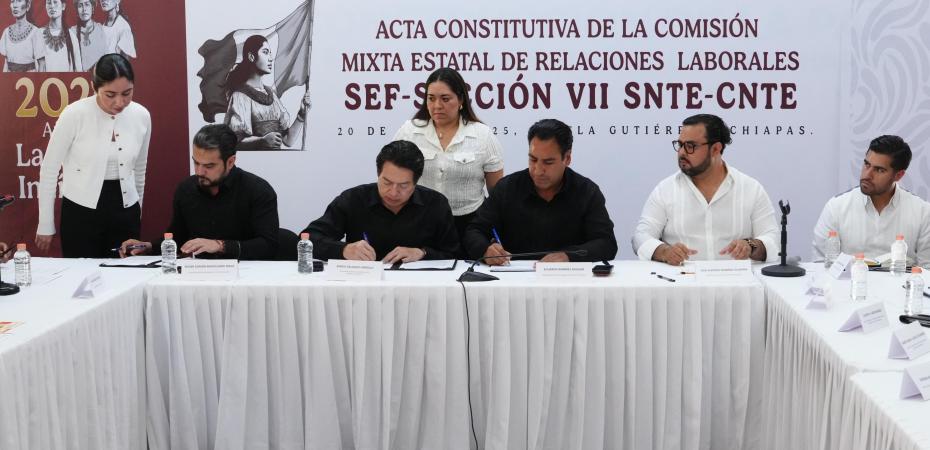 Tuxtla Gutiérrez, Chis.-En atención al compromiso de la Presidenta Claudia Sheinbaum Pardo con las y los maestros del estado de Chiapas, el secretario de Educación Pública (SEP), Mario Delgado Carrillo, en coordinación con el gobernador de Chiapas, Eduardo Ramírez Aguilar, firmó el Acta Constitutiva de la Comisión Mixta Estatal de Relaciones Laborales SEF-Sección 7 SNTE-CNTE.