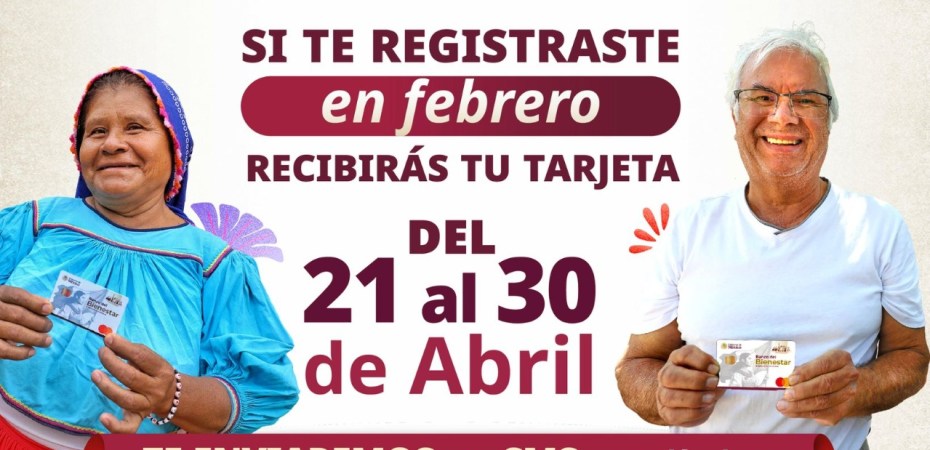 La secretaria de Bienestar, Ariadna Montiel Reyes, informó que, del 21 al 30 de abril, se realiza en todo el país la entrega de tarjetas del Banco del Bienestar a quienes se registraron a las Pensiones Mujeres Bienestar y para Personas Adultas Mayores.