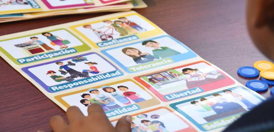 Con actividades lúdicas y juegos, como sopa de letras, canicas, laberintos y serpientes y escaleras, niñas y niños aprenden valores como el respeto, el diálogo, la tolerancia, la igualdad, la justicia y la participación ciudadana.