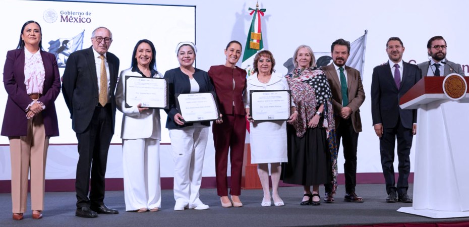 Durante la conferencia de prensa, la Presidenta de México entregó los reconocimientos Graciela Arroyo de Cordero 2025 a las enfermeras Juana Jiménez Sánchez, quien también es doctora y tiene 50 años de servicio; el premio María Guadalupe Cerisola Salcido a la enfermera Yolanda Flores Peña; y el premio María Suárez Vázquez a la maestra Sandra Sonalí Olvera Arreola.