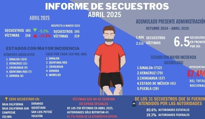 - Estados que reportaron cero secuestros durante abril 2025: Baja California, Baja California Sur, Campeche, Colima, Durango, Querétaro, San Luis Potosí y Yucatán.