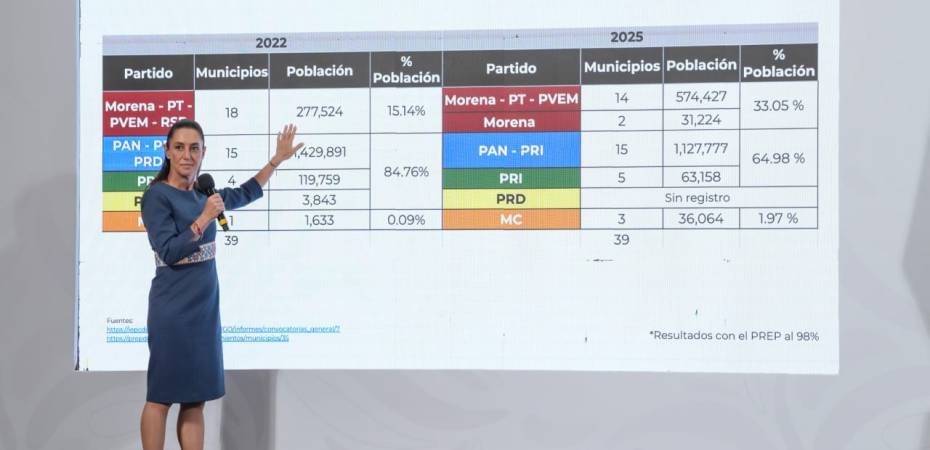 Aunque en ambas entidades Morena tuvo un retroceso en el número de municipios aganados, la Sheinbaum se enfocó en el número de población que ahora gobernará la coalición de la Cuarta Transformación.