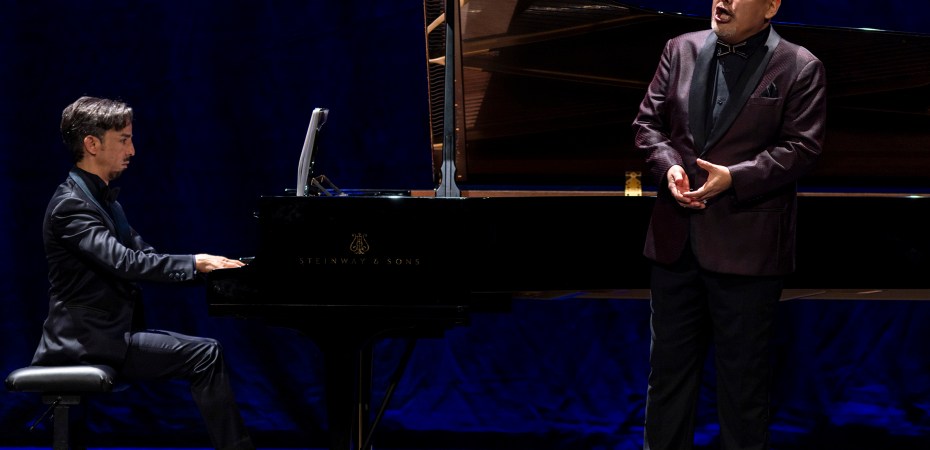 La escena predominó el color azul para ambientar la presencia de Ángel Rodríguez, pianista y el tenor Javier Camarena que fueron recibidos con fuertes aplausos desde que pisaron el escenario.