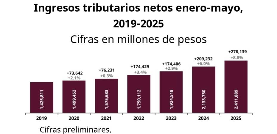 De enero a mayo, se recaudó 1 billón 371 mil millones de pesos por concepto de impuesto sobre la renta (ISR), lo que representa 149 mil 902 millones de pesos más que en el mismo periodo de 2024 y un incremento real de 8.1 por ciento.