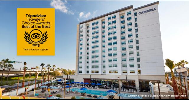 NORTH BETHESDA, Maryland. — Choice Hotels International, Inc. (NYSE: CHH), uno de los principales franquiciadores de hospedaje del mundo, se enorgullece en anunciar que casi 300 propiedades de Choice Hotels han sido reconocidas con los premios Travelers’ Choice® Awards de Tripadvisor® para 2025, incluido el Cambria® Hotel & Suites Anaheim Resort Area, que fue honrado como ganador de Best of the Best en la categoría altamente competitiva Family-Friendly.