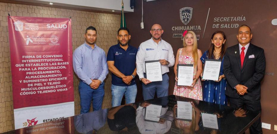 CHIHUAHUA, Chihuahua. – Con el propósito de establecer una coordinación técnica y operativa en la procuración, procesamiento, almacenamiento y suministro de tejidos humanos, las Secretarías de Salud del Estado de México y de Chihuahua firmaron un convenio de colaboración que permitirá mejorar la atención médica a pacientes que requieren injertos de piel, tejido musculoesquelético o membrana amniótica.