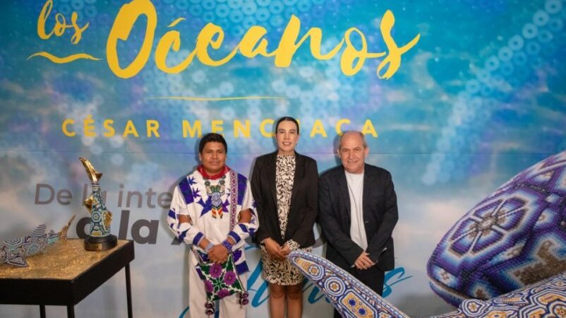 La secretaria de Turismo del Gobierno de México, Josefina Rodríguez Zamora; el fundador y CEO de Menchaca Studio, César Menchaca; y el artesano wixárika Idelfonso López Carrillo, en representación de las y los artesanos, inauguraron la exposición El Murmullo de los Océanos en el espacio Punto México de la Secretaría de Turismo (Sectur).