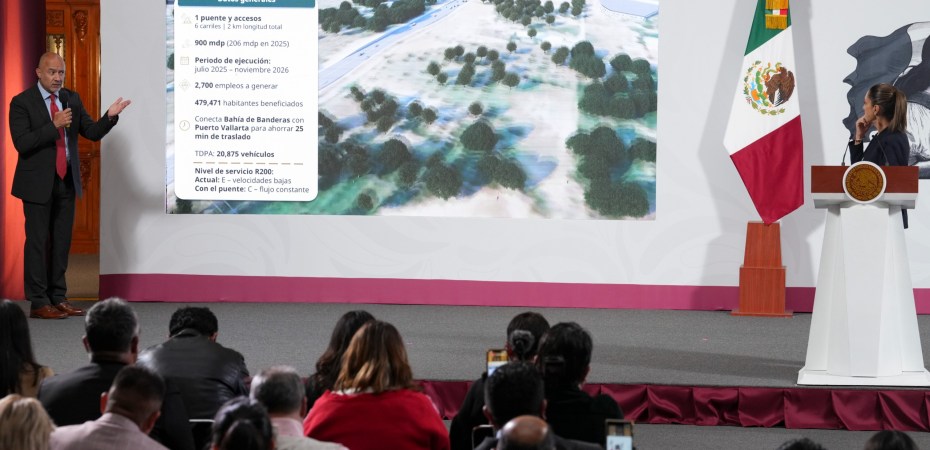Jesús Antonio Esteva Medina, secretario de Infraestructura, Comunicaciones y Transportes (SICT), expone las características del puente vehicular Amado Nervo, para unir la Bahía de Banderas, Nayarit, con Puerto Vallarta, Jalisco; su inversión es de 900 millones de pesos que concluirá en noviembre del 2026.