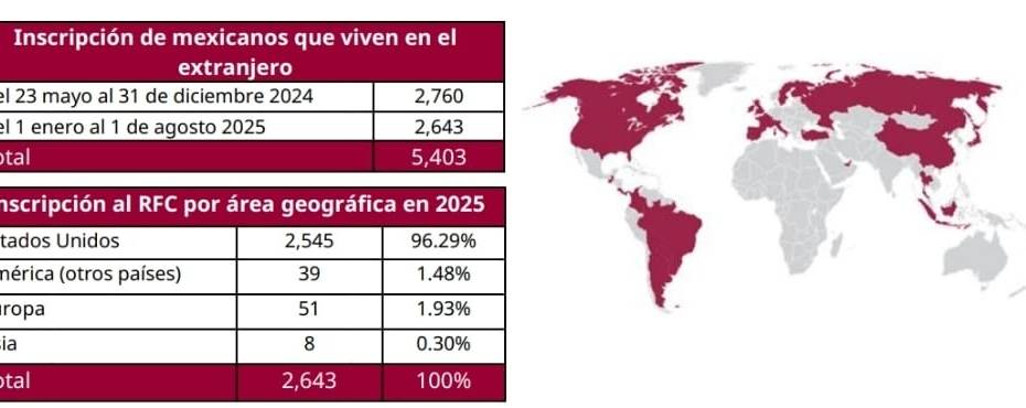En tanto, del 1 de enero al 1 de agosto de 2025, se han inscrito al RFC por este canal de atención 2 mil 643 personas mexicanas en el extranjero con residencia en 43 países, siendo Estados Unidos el principal con 2 mil 545 trámites realizados desde 48 ciudades.
