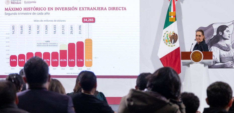 Durante la mañanera del Pueblo, la presidenta Claudia Sheinbaum Pardo presumió que México registró un récord en inversión extranjera directa del segundo trimestre de 2025, reflejando un crecimiento significativo en dicho rubro con 34 mil 265 millones de dólares; este avance representa un resultado positivo para México en coordinación con la Secretaría de Economía (SE).