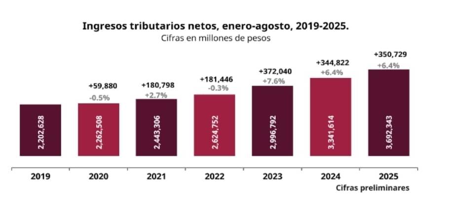 Esta cifra implica un incremento nominal de 350 mil 729 millones de pesos, con lo que se consolida la recaudación tributaria, al superar lo programado para este periodo en la Ley de Ingresos de la Federación 2025, con un cumplimiento de 102.3 por ciento.
