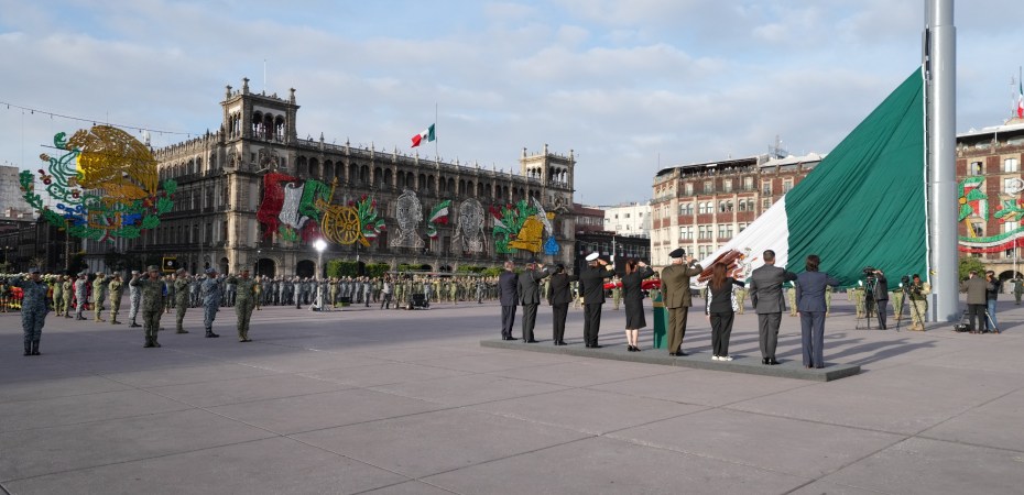 La presidenta Claudia Sheinbaum Pardo encabezó la ceremonia de izamiento de la bandera nacional a media asta en memoria de las víctimas del sismo del 19 de septiembre de 1985 y 2017, en el Zócalo de la CDMX.