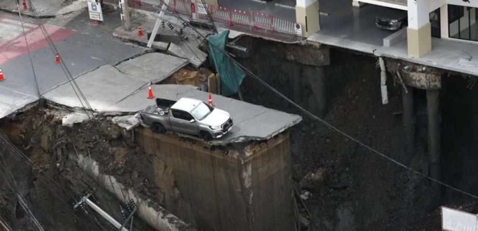 Un enorme socavón de aproximadamente 50 metros de profundidad y unos 30 × 30 metros de ancho se abrió de manera abrupta este miércoles por la mañana en Samsen Road, en el distrito Dusit de Bangkok, justo frente al hospital Vajira.  La calzada colapsó, tuberías de agua se rompieron, postes de electricidad cayeron y una grúa estacionada fue engullida parcialmente.  A pesar de la magnitud del hundimiento e impactos en infraestructura, las autoridades confirmaron que no hay víctimas mortales ni heridos hasta el momento.