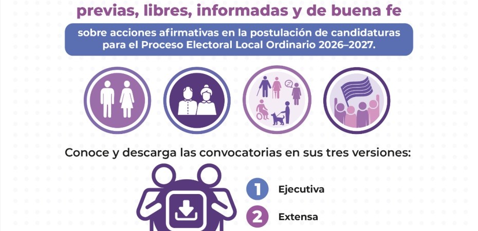 El Instituto Electoral de la Ciudad de México (IECM) publicó la convocatoria para la Consulta previa, libre, informada y de buena fe a personas ciudadanas jóvenes, mayores, con discapacidad y de la diversidad sexual y de género (LGBTTTIQA+) sobre acciones afirmativas en la postulación de candidaturas en el Proceso Electoral Local Ordinario 2026-2027 en la Ciudad de México.