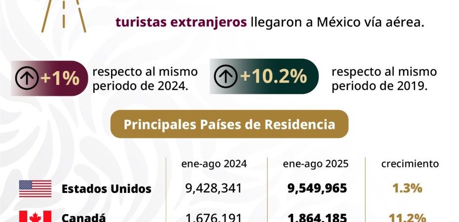 La secretaria de Turismo del Gobierno de México, Josefina Rodríguez Zamora, informó que, entre enero y agosto de 2025, México recibió 14 millones 87 mil turistas extranjeros vía aérea, según su país de residencia.