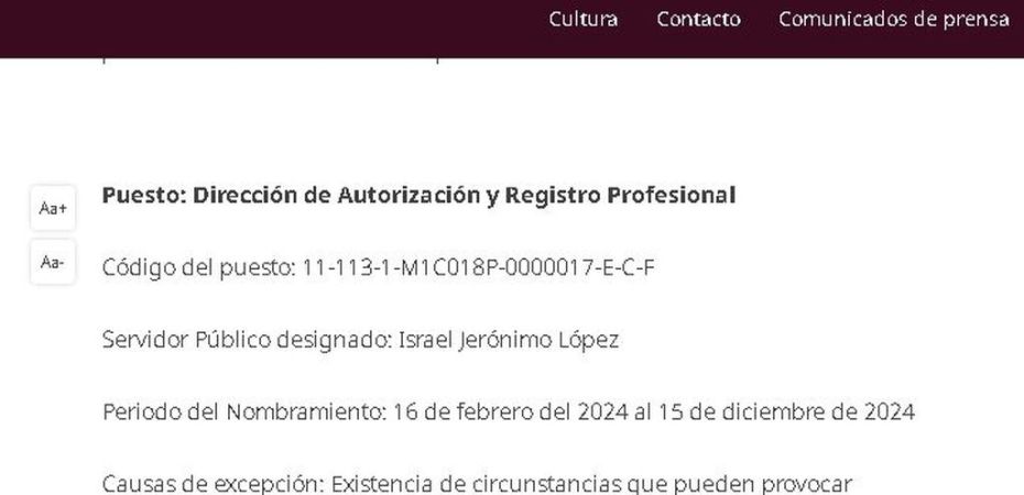 Las cédulas de maestría y doctorado del funcionario fueron emitidas precisamente por el área de Autorización y Registro Profesional, la misma que él mismo encabeza desde el 16 de febrero de 2024 (https://acortar.link/n7bjk4). Ambas cédulas fueron expedidas en abril de 2024, y de forma igualmente irregular: primero la de doctorado (4 de abril) y luego la de maestría (11 de abril).