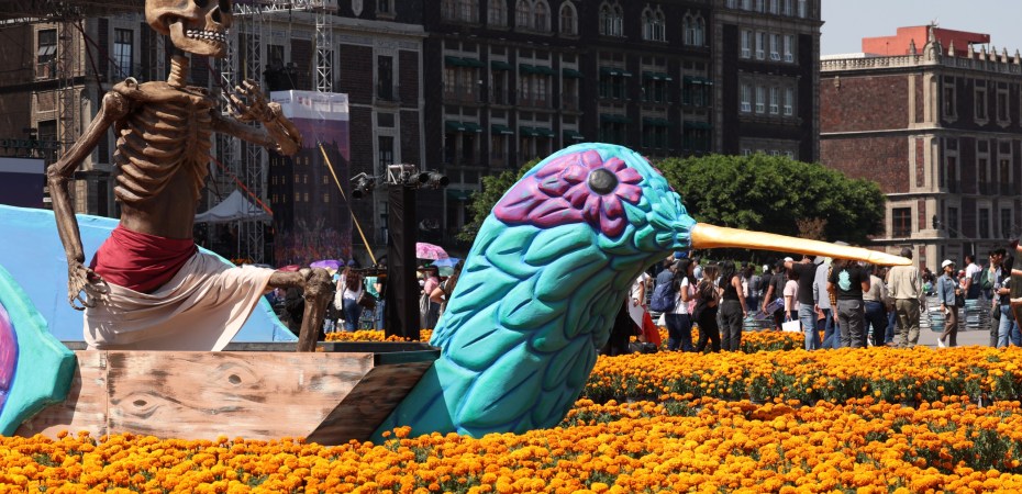 *La Plaza de la Constitución se llenó de obras artísticas de cartonería, aspectos naturales y espirituales, deidades de la cosmogonía mesoamericana, un tapete de semillas y un arco de flores monumental, así como más de 100 mil plantas de cempasúchil