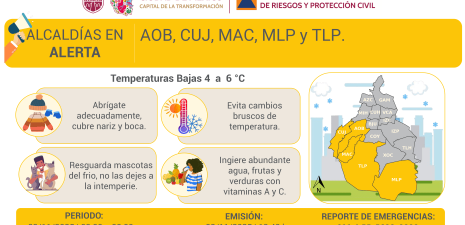 La Secretaría de Gestión Integral de Riesgos y Protección Civil informa que, se activa Alerta Amarilla por pronóstico de temperaturas bajas para las primeras horas de mañana, en partes altas de las demarcaciones: Álvaro Obregón, Cuajimalpa, Magdalena Contreras, Milpa Alta y Tlalpan.