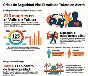 Los números no mienten, El Valle de Toluca arrojó más del 50 por ciento de las muertes viales en el Estado de México, con 813 fallecimientos y las vialidades con mayor peligro son Avenida Las Torres, Avenida Tecnológico, Isidro Fabela, Tollocan y la entrada a San Mateo Atenco, así como los alrededores de las terminales de autobuses.