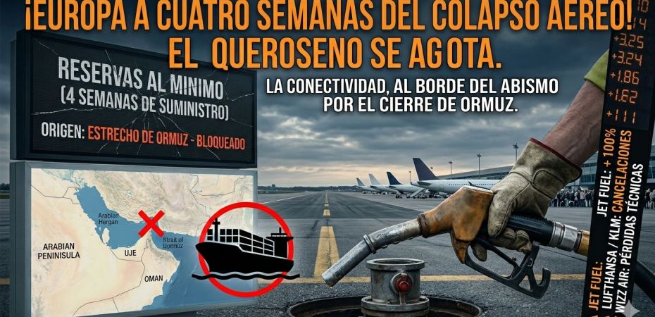 Europa ha entrado en una cuenta regresiva mortal para su conectividad. Según las advertencias más recientes de la Agencia Internacional de la Energía (AIE), el continente dispone de apenas cuatro semanas de inventario de combustible de aviación antes de alcanzar niveles de desabastecimiento total. La parálisis operativa no es una posibilidad lejana, es una amenaza inmediata. A diferencia del crudo, Europa carece de reservas estratégicas de queroseno (producto refinado), lo que deja a los aeropuertos a merced de un suministro que hoy está virtualmente cortado.